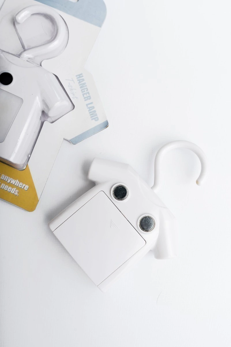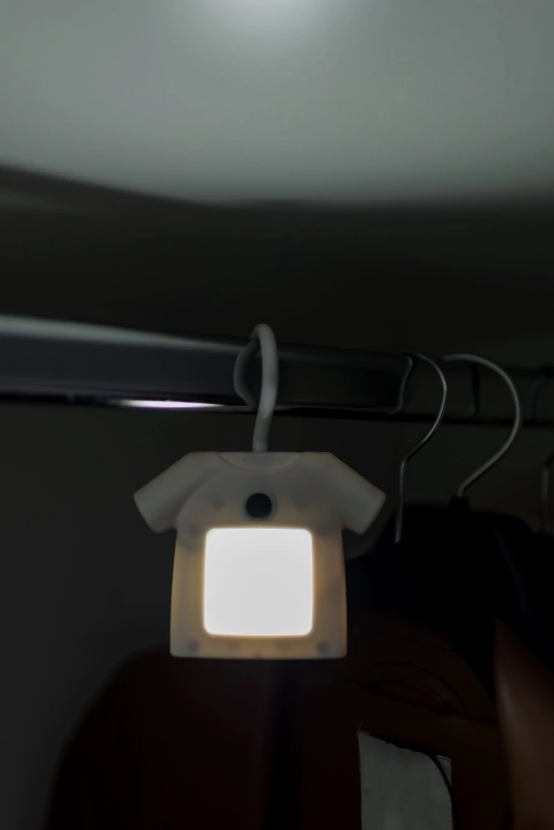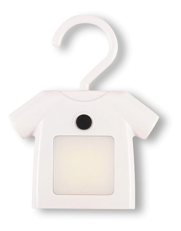 Características: Colgador de plástico en forma de camiseta con gancho giratorio de 360 grados, imán trasero no adhesivo, interruptor de encendido / apagado con sensor y luz nocturna LED COB.